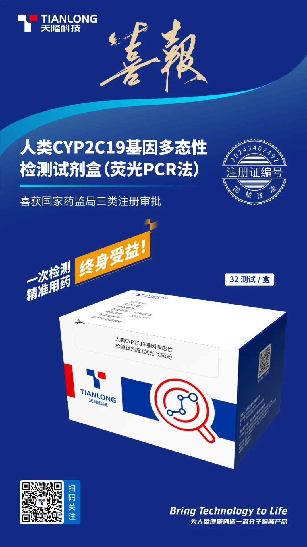 近日,由天隆科技自主研發的人類CYP2C19基因多態性檢測試劑盒(熒光PCR法)通過國家藥監局三類注冊,獲批上市,天隆三類藥物基因檢測家族又添新成員。