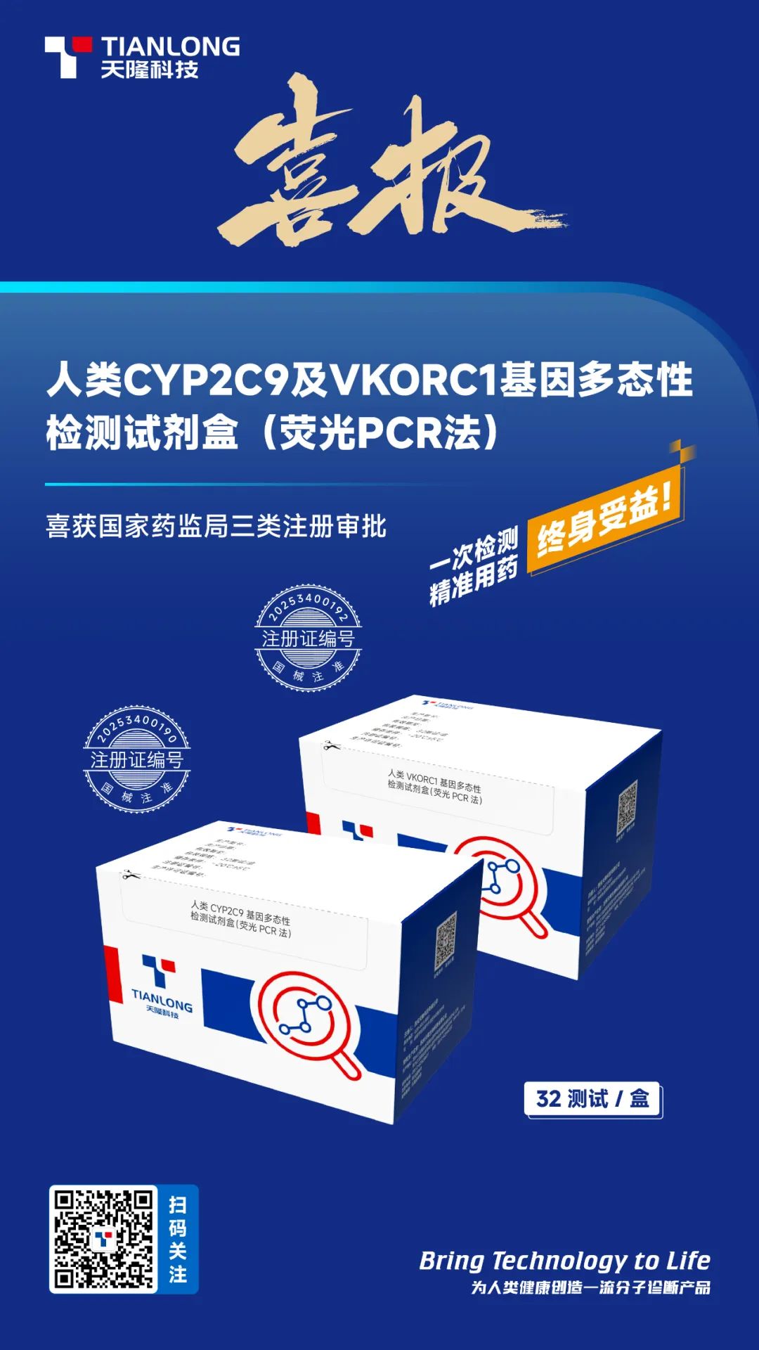 天隆科技自主研發的人類CYP2C9及VKORC1基因多態性檢測試劑盒(熒光PCR法)通過國家藥監局注冊審批,獲得三類醫療器械注冊證,天隆藥物基因家族再添新成員。